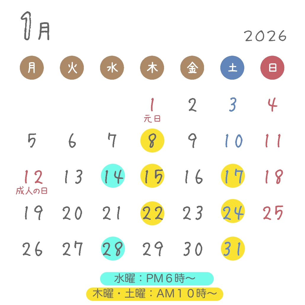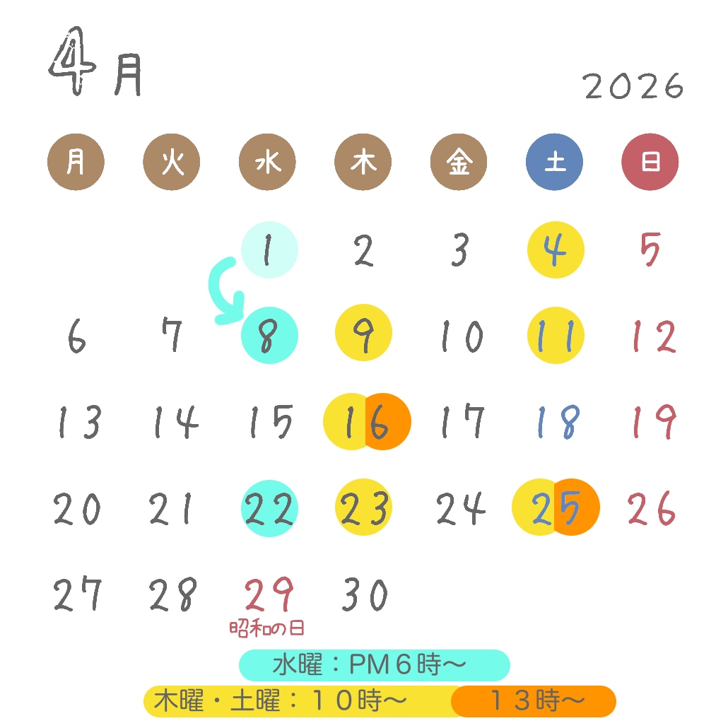 2022年7月より、木曜、土曜のお教室は、午前中満席である場合、ご希望により午後からの追加クラスをすることにしました!予定ノートで満席の日でも、講師にお問い合わせください!